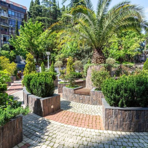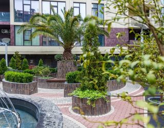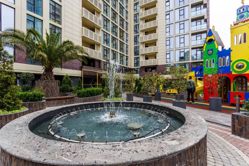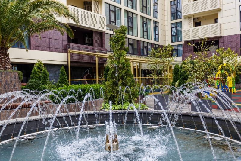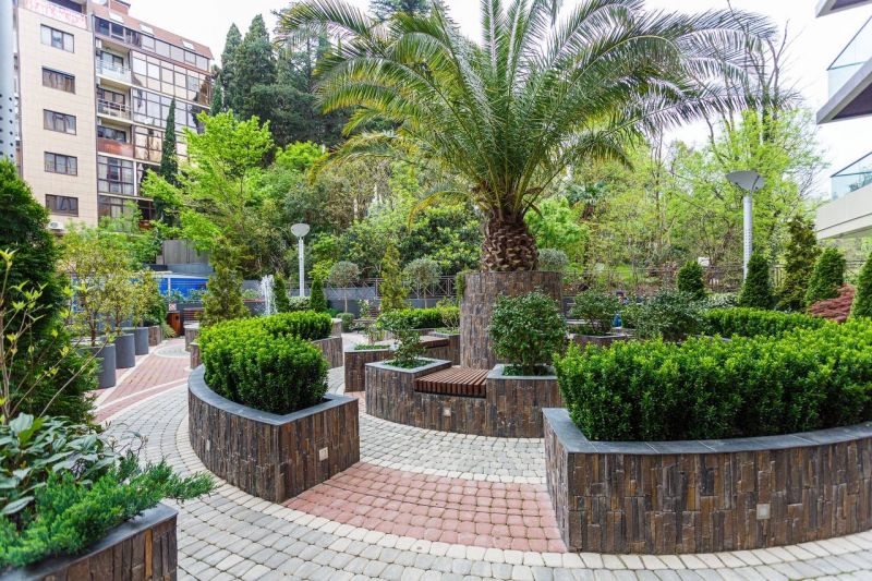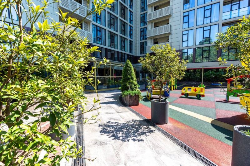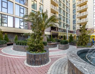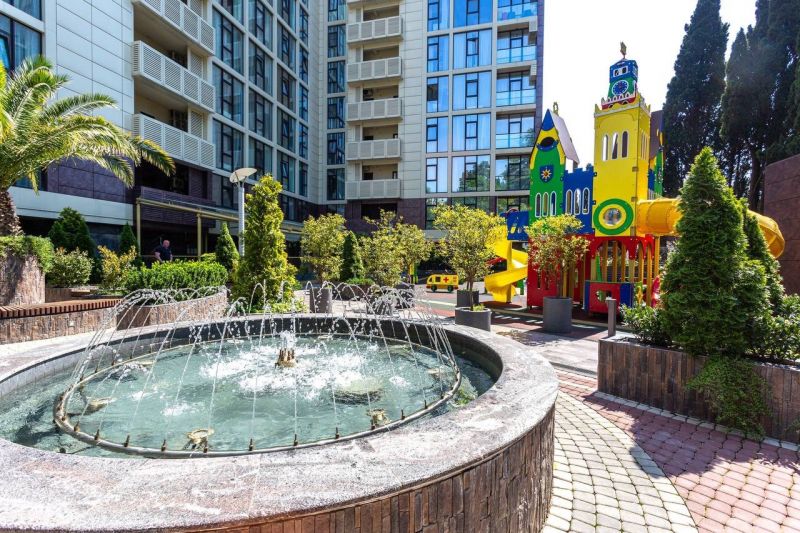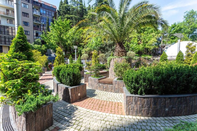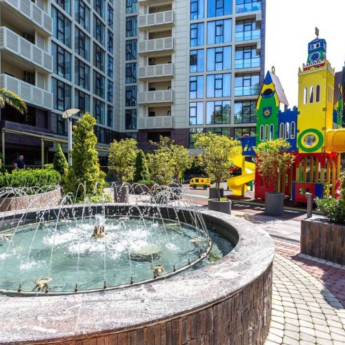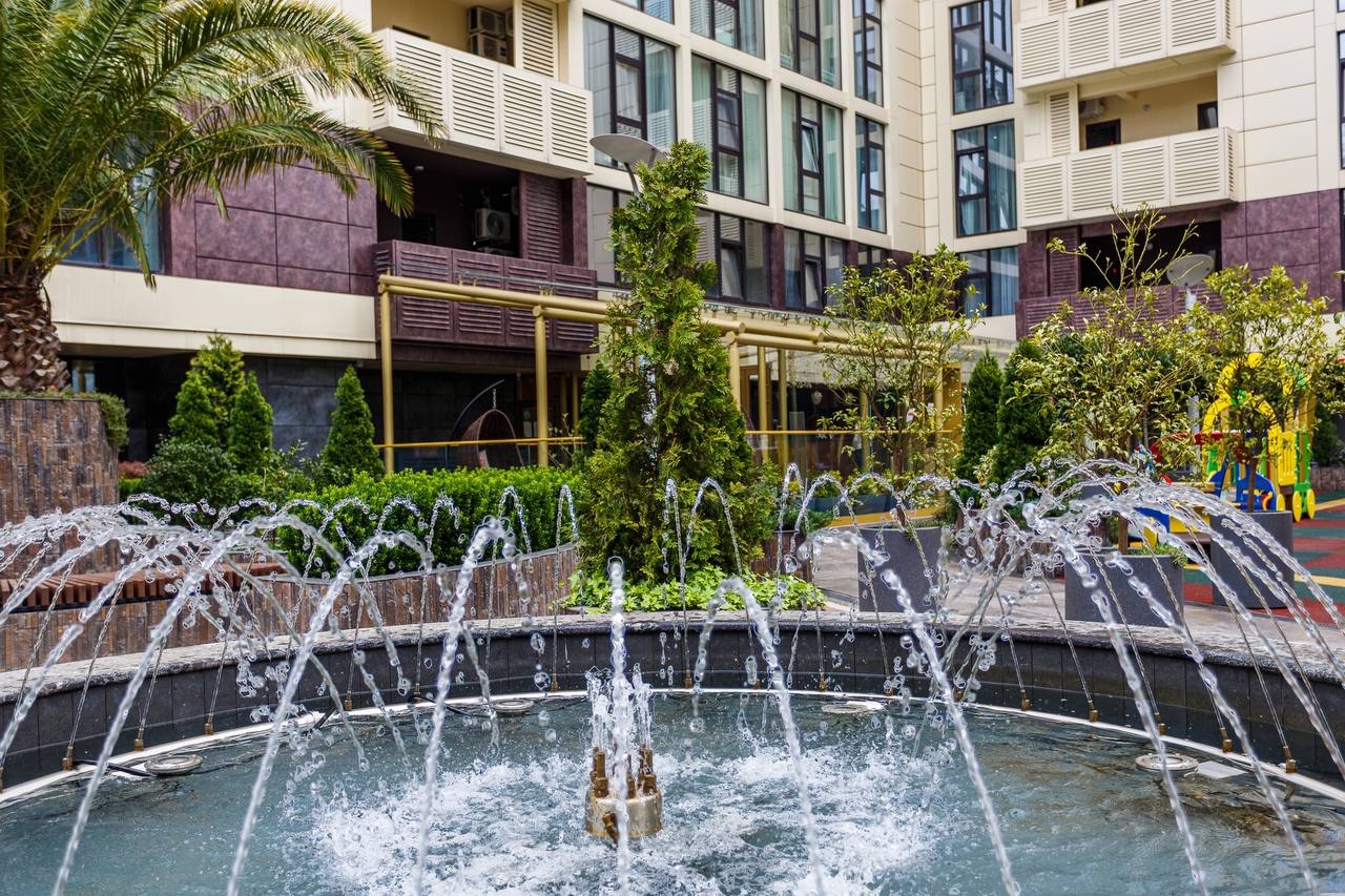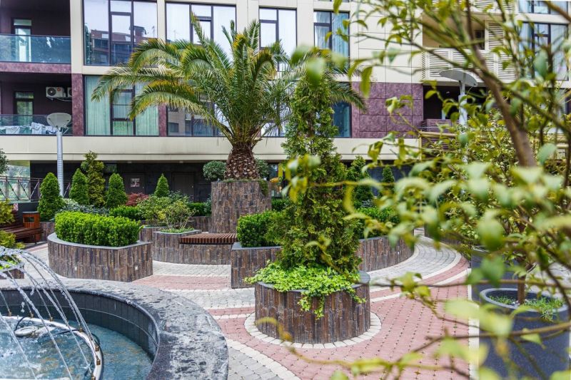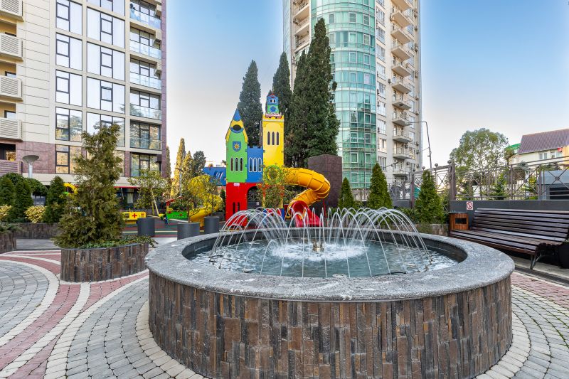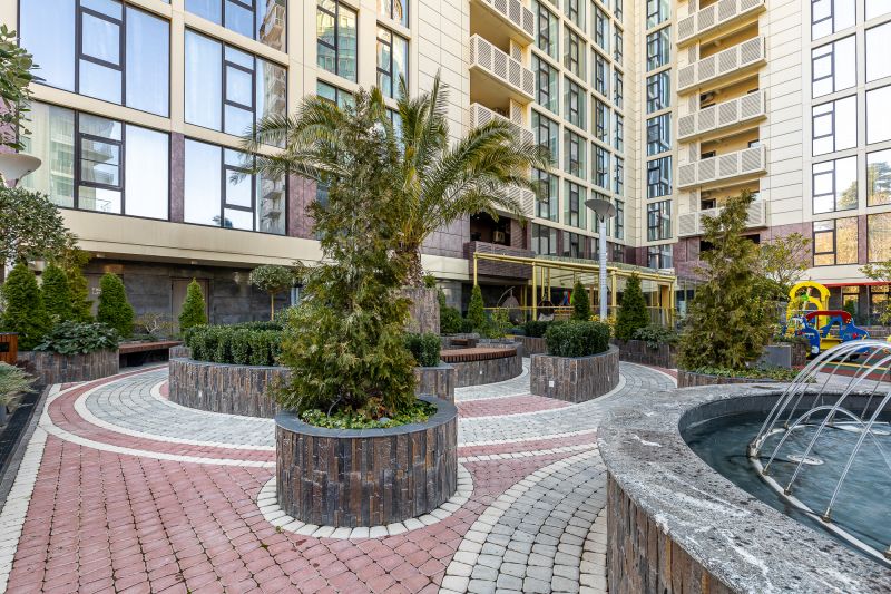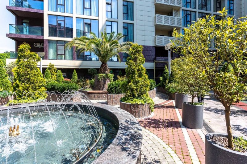 На территории с ландшафтным дизайном, в котором использованы разнообразные растения, создана уютная лаунж-зона с фонтаном, есть детская игровая площадка, настольный теннис, спортивная площадка, уличные тренажеры, открытый бассейн, парковка (по запросу).
