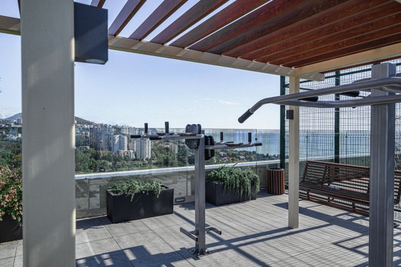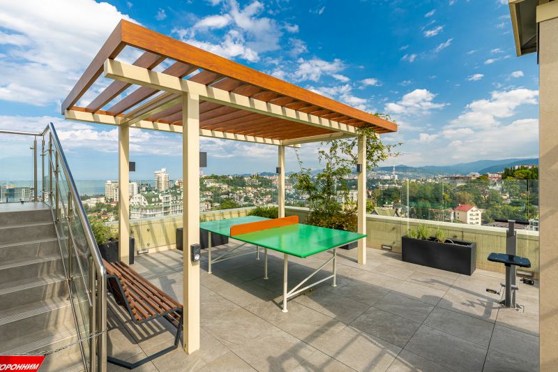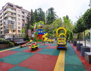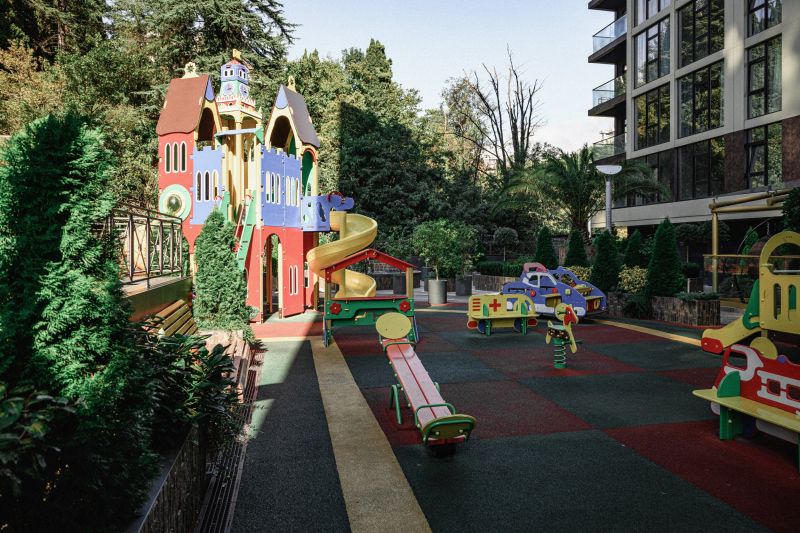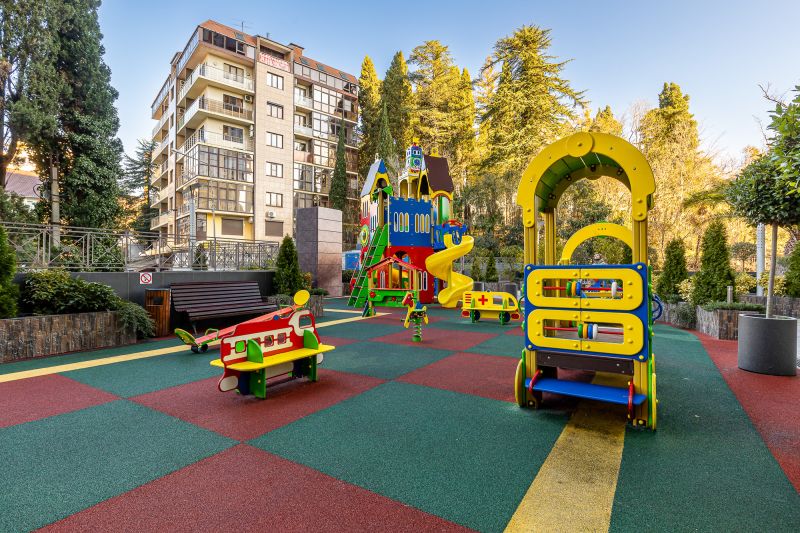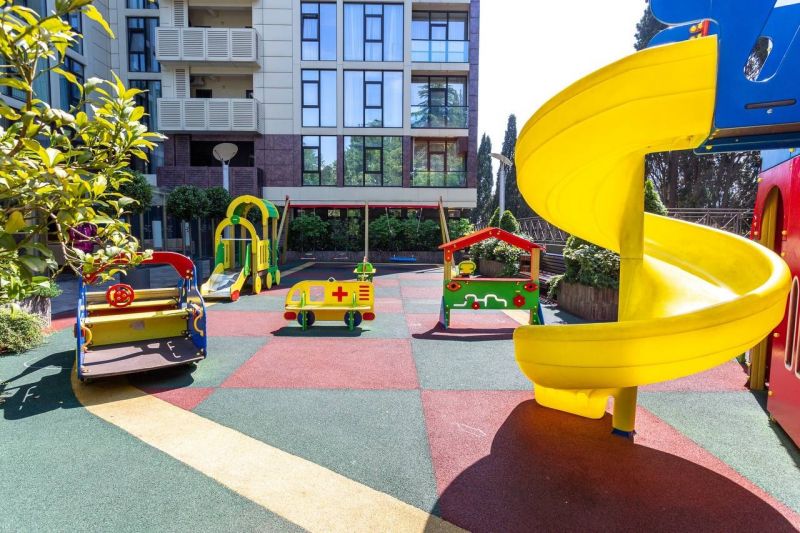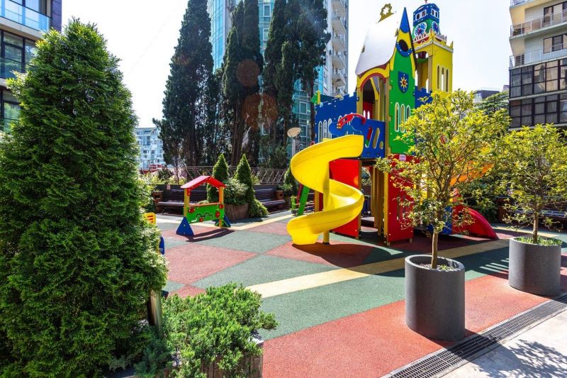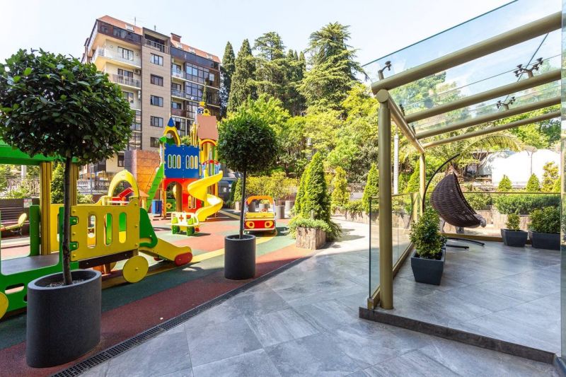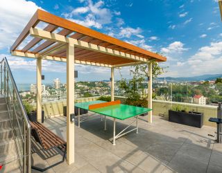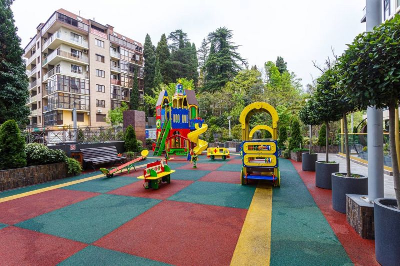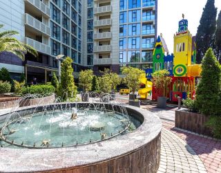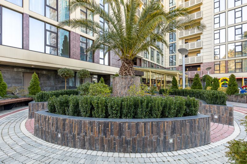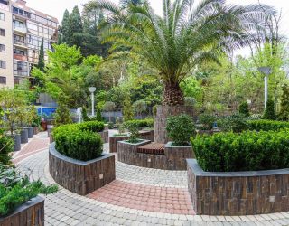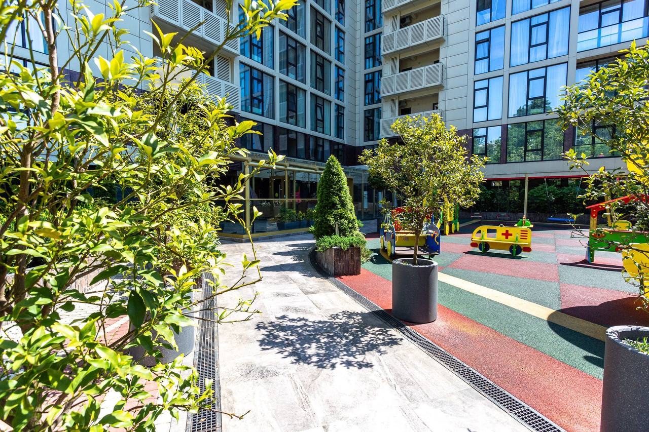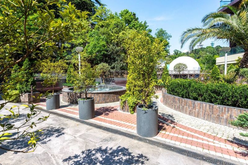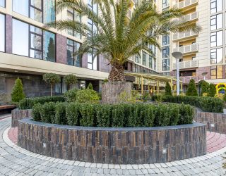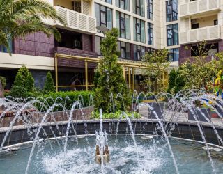 На территории с ландшафтным дизайном, в котором использованы разнообразные растения, создана уютная лаунж-зона с фонтаном, есть детская игровая площадка, настольный теннис, спортивная площадка, уличные тренажеры, открытый бассейн, парковка (по запросу).