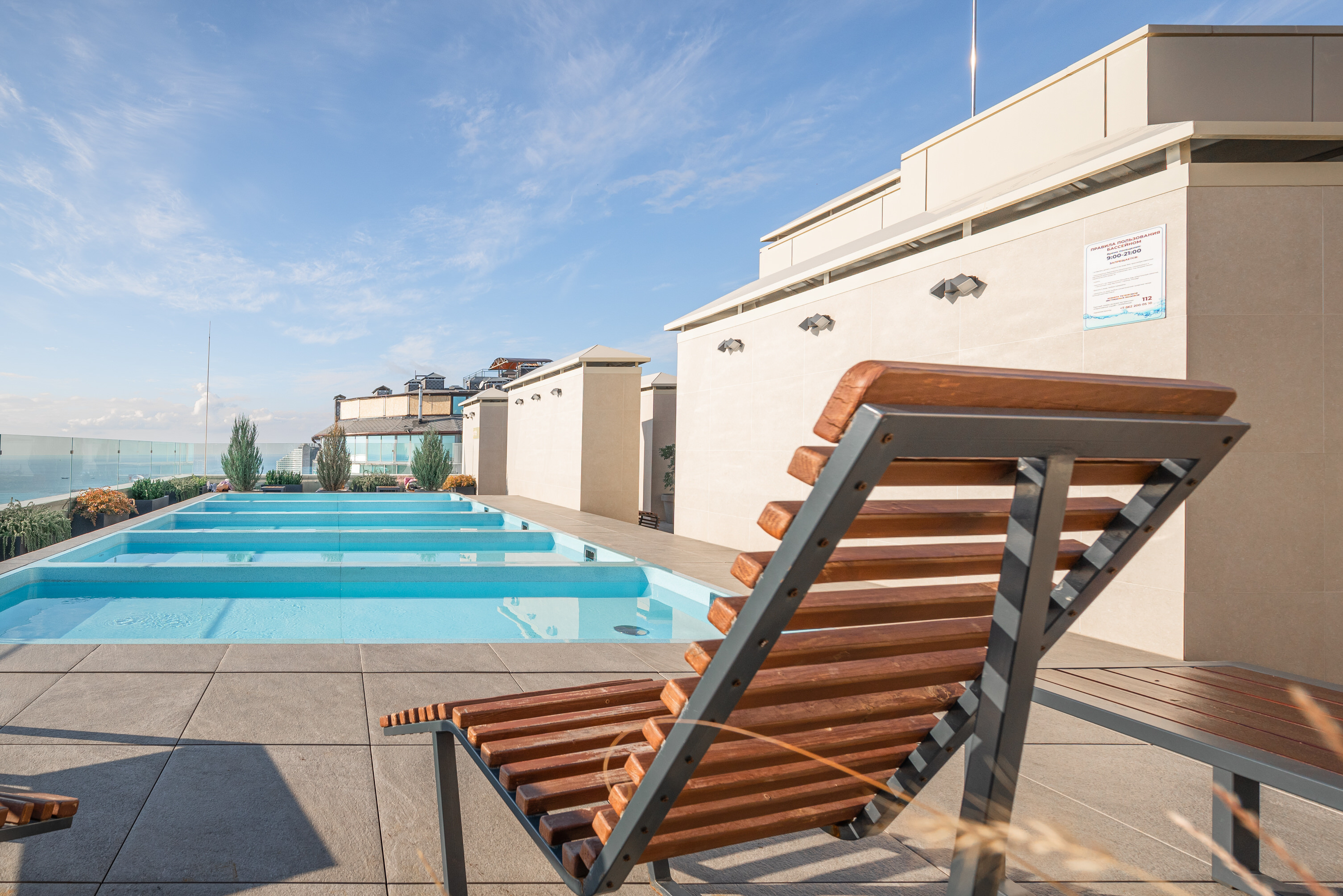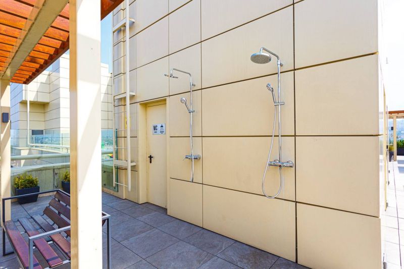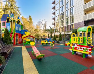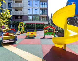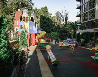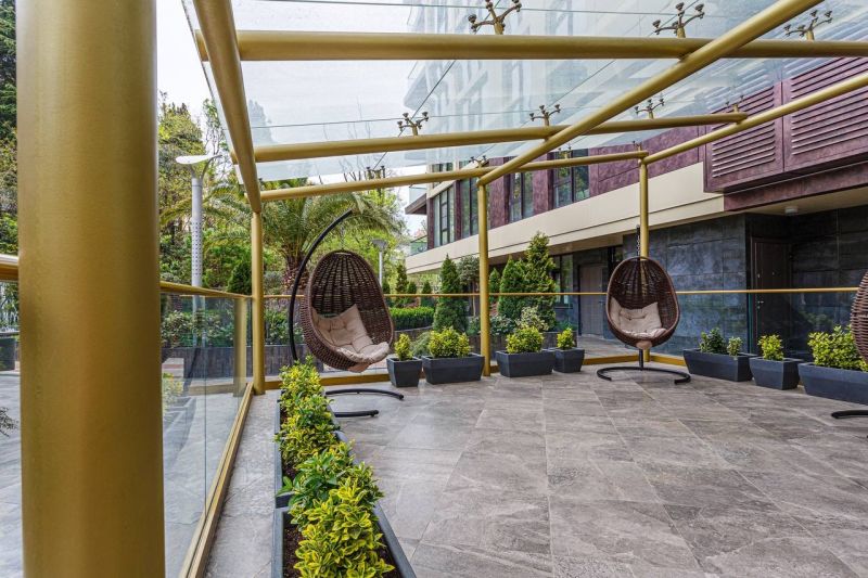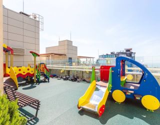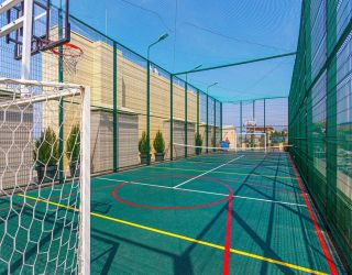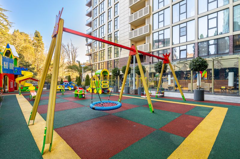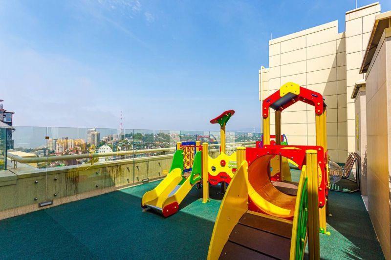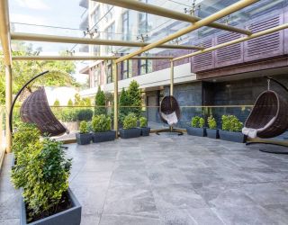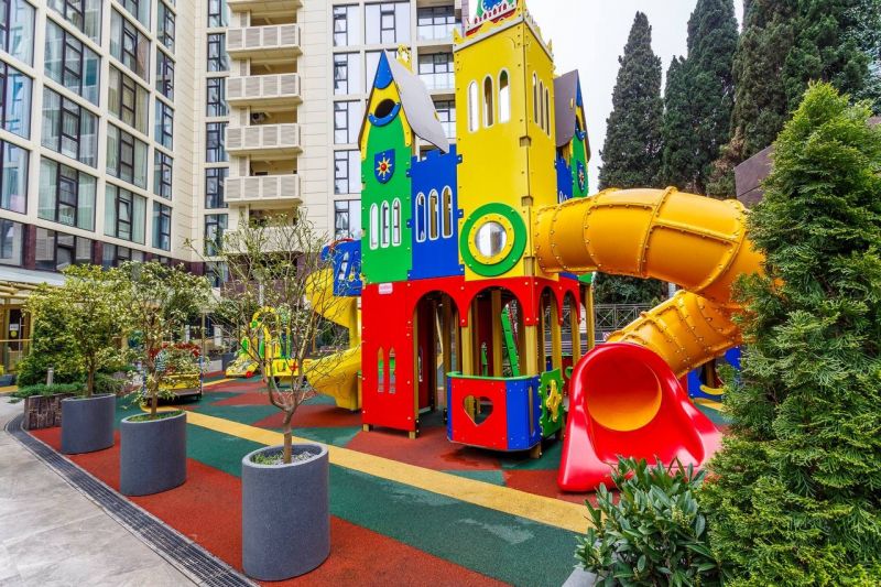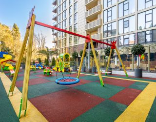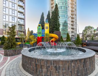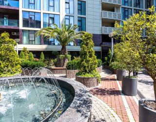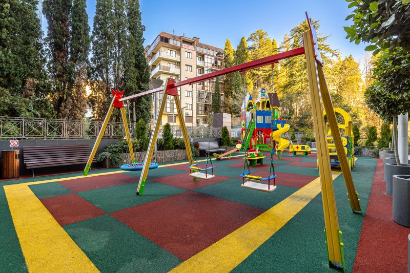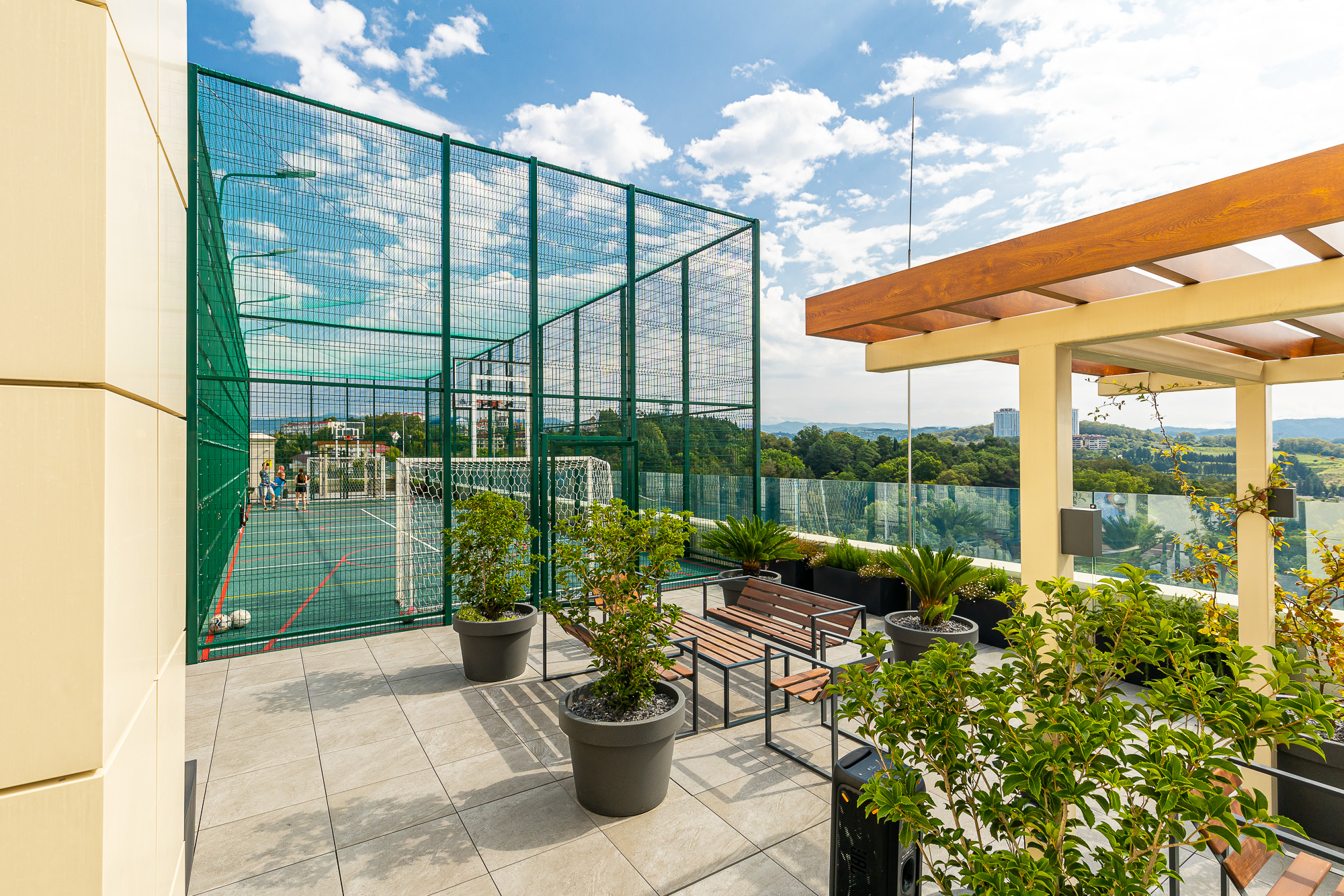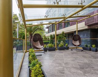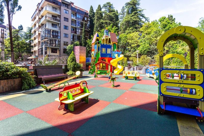 На территории с ландшафтным дизайном, в котором использованы разнообразные растения, создана уютная лаунж-зона с фонтаном, есть детская игровая площадка, настольный теннис, спортивная площадка, уличные тренажеры, открытый бассейн, парковка (по запросу).
