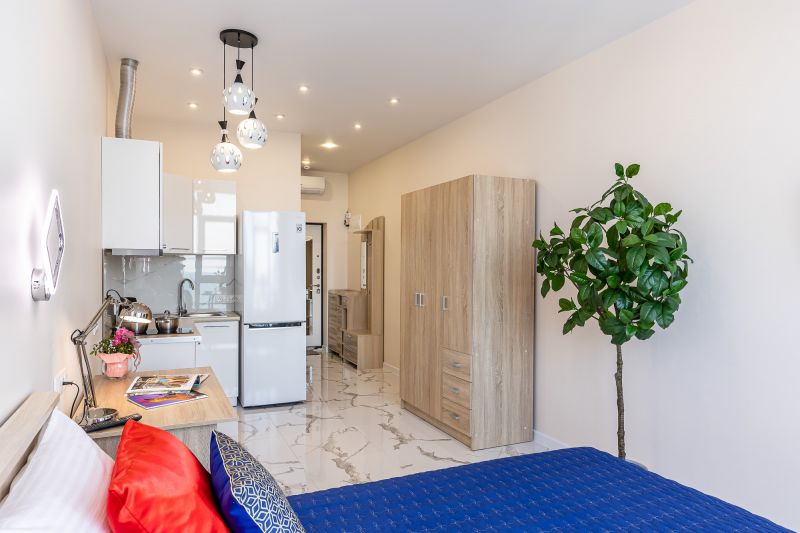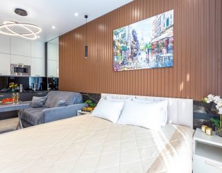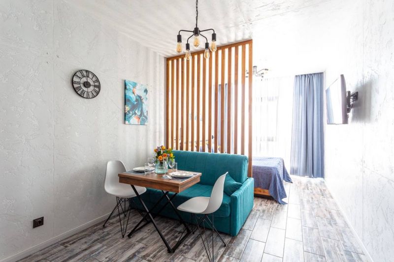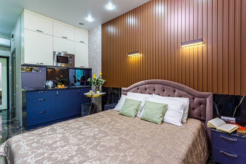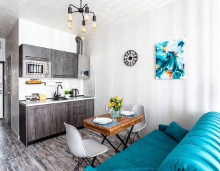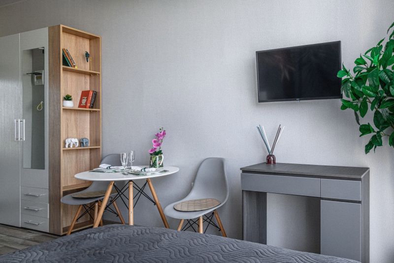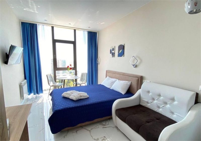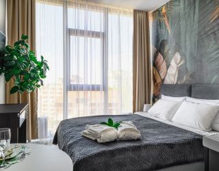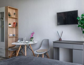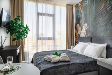 Апартаменты разместились в современном многоэтажном здании, оснащенном лифтами и оснащены необходимой мебелью, комфортабельными спальными местами, сплит-системой, телевизором, собственным санузлом с душевой кабиной и стиральной машиной. Во всех апартаментах есть кухонный уголок с холодильником, электрическим чайником, плитой и набором посуды.